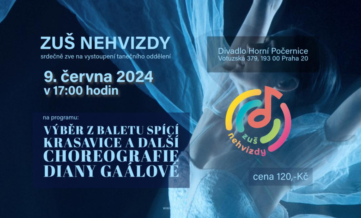 Zuš Nehvizdy vás zve na jedinečné vystoupení plné radosti, vášní a nových tanečních choreografií. Připravte se na výběr z příběhu Spící krasavice od P. I. Čajkovského spolu s dalšími svěžími výtvory. Tanečníci Zuš Nehvizdy vám přinesou nezapomenutelný zážitek plný krásy, emoce a tance. Přijďte se s námi ponořit do světa umění a nechte se unést naší radostí pro taneční vyjádření!" Spící krásavice je klasické baletní dílo vytvořené skladatelem Petrem Iljičem Čajkovským a choreografem Mariusem Petipou. Premiérově bylo uvedeno v Petrohradě roku 1890. Příběh je založen na pohádce francouzského spisovatele Charlese Perraulta.
